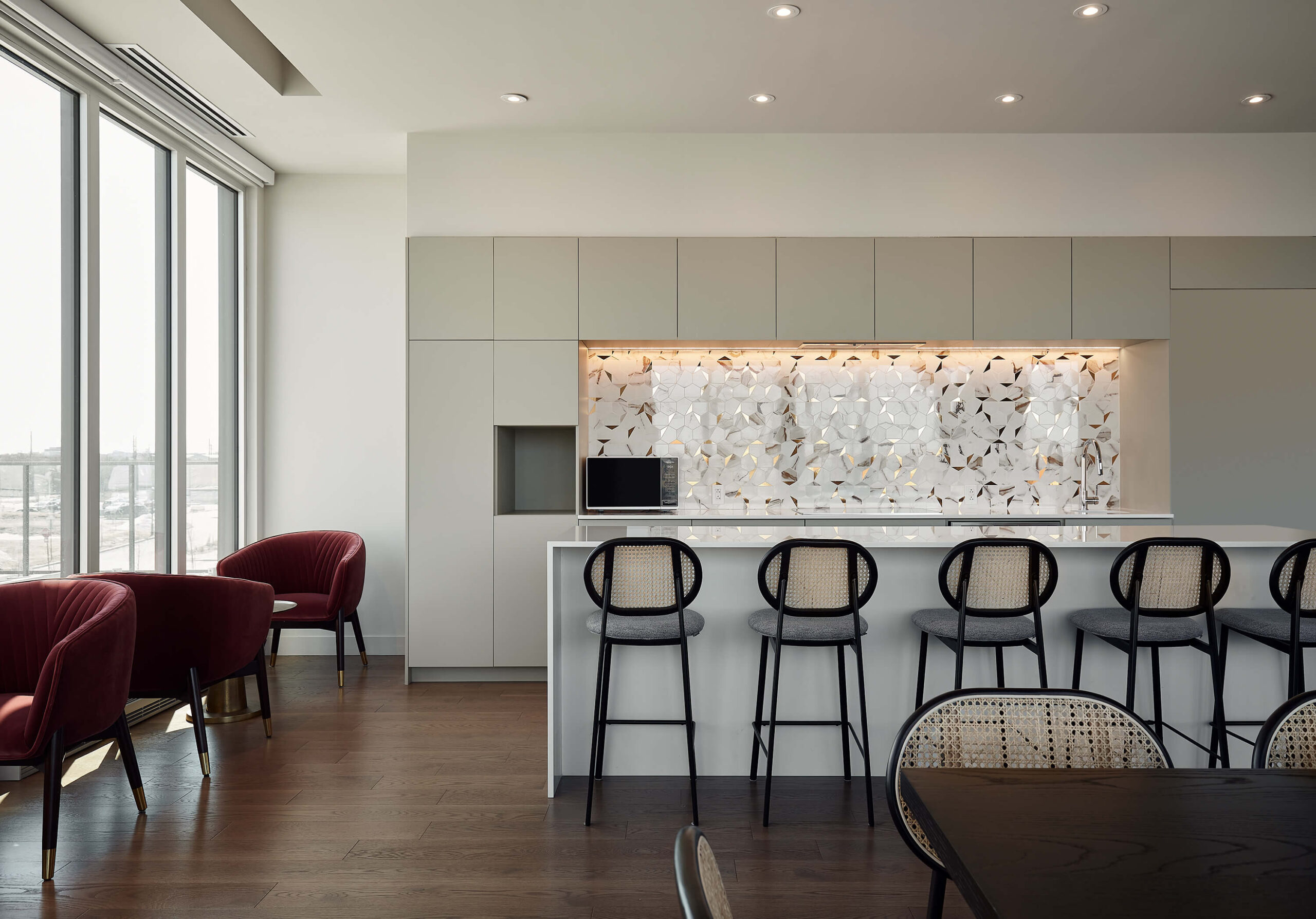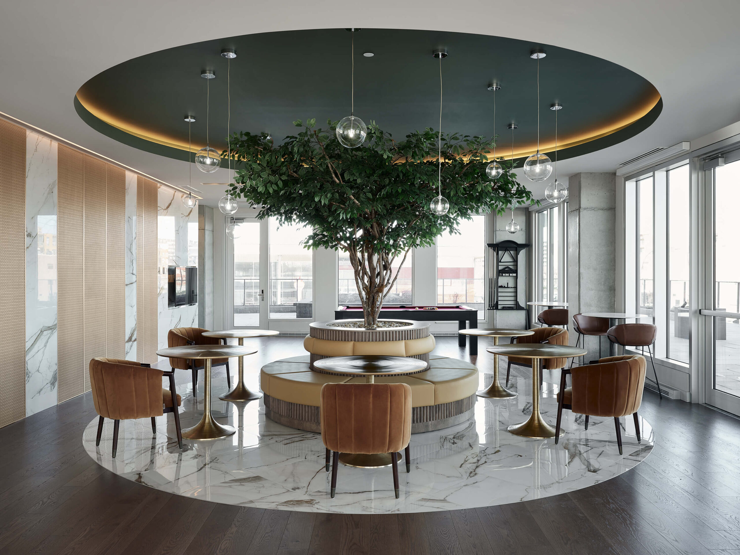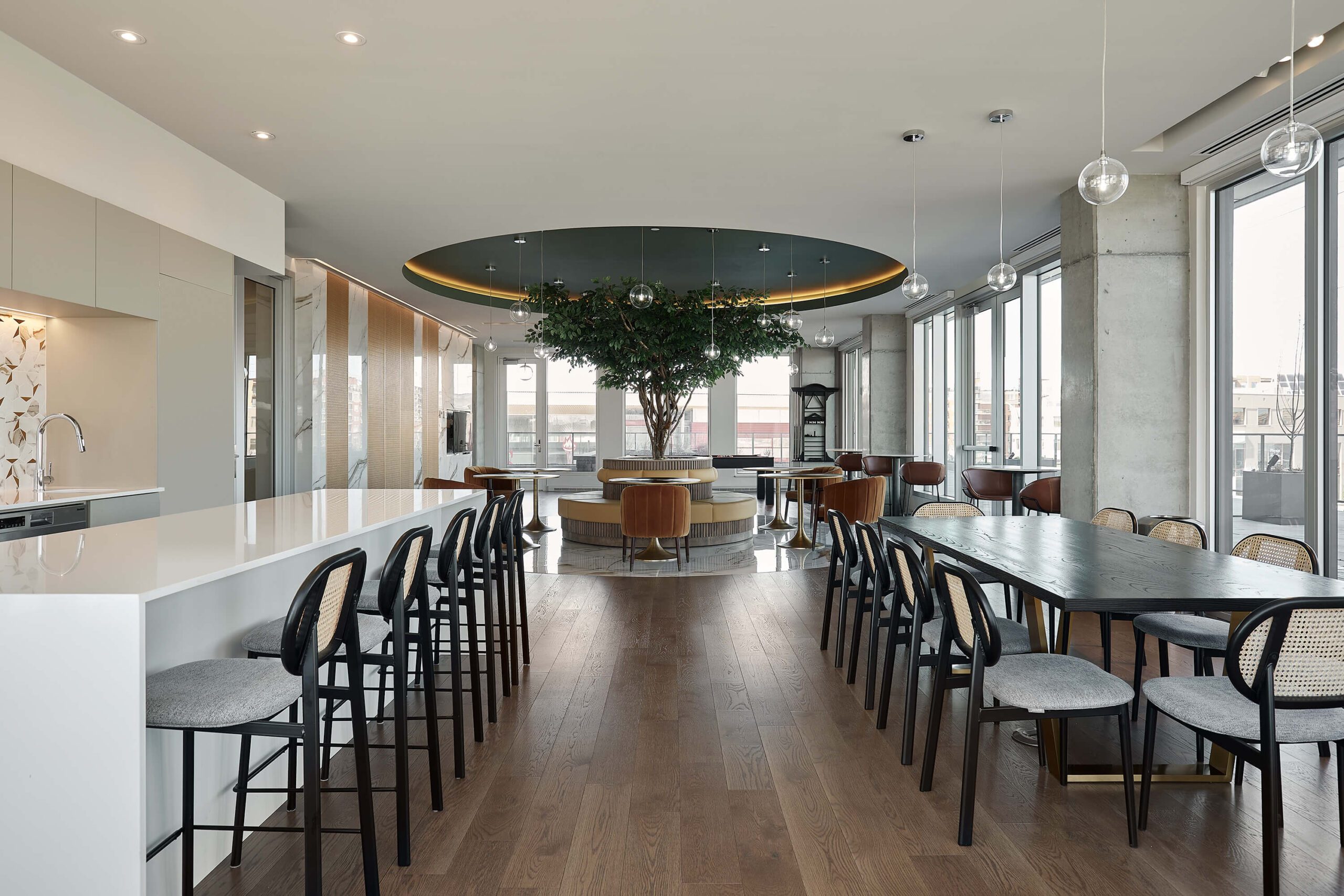 The urban cottage located in the Belvedere Tower of the Voltige real estate project in Montréal, offers tenants a festive and inviting common space, where it is good to gather, share and have fun. It includes entertainment, relaxation, co-working spaces and an impressive common kitchen, all adjacent to a very large terrace and a pool. The urban cottage occupies a central place in the lives of the tenants, which is why we paid particular attention to the layout, finish selections and custom furniture design. For this urban cottage, neutral tones are supported by current accent colours such as pink and green, golden walls and a central tree defined by a circular ceiling drop that helps define the different spaces.