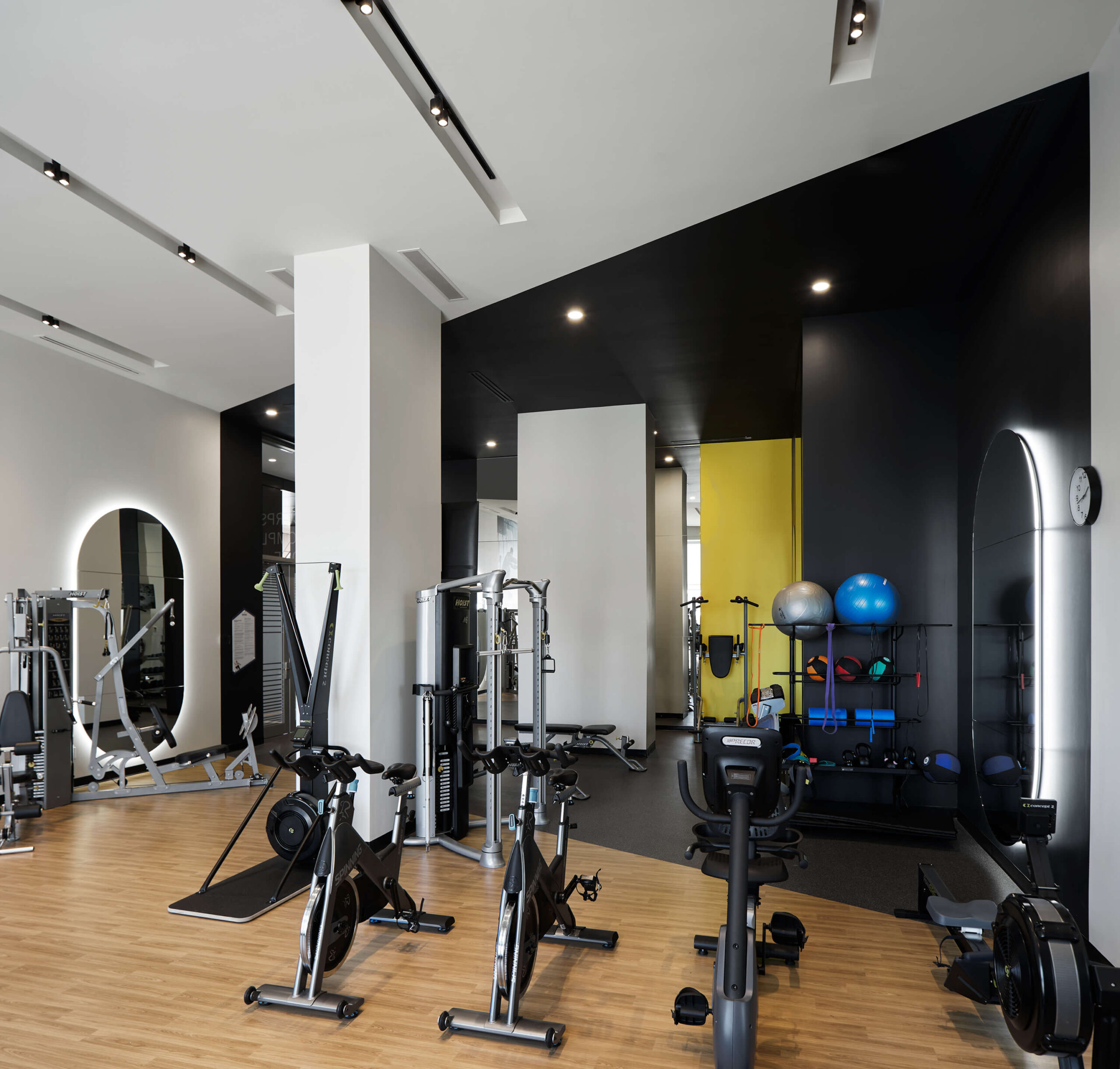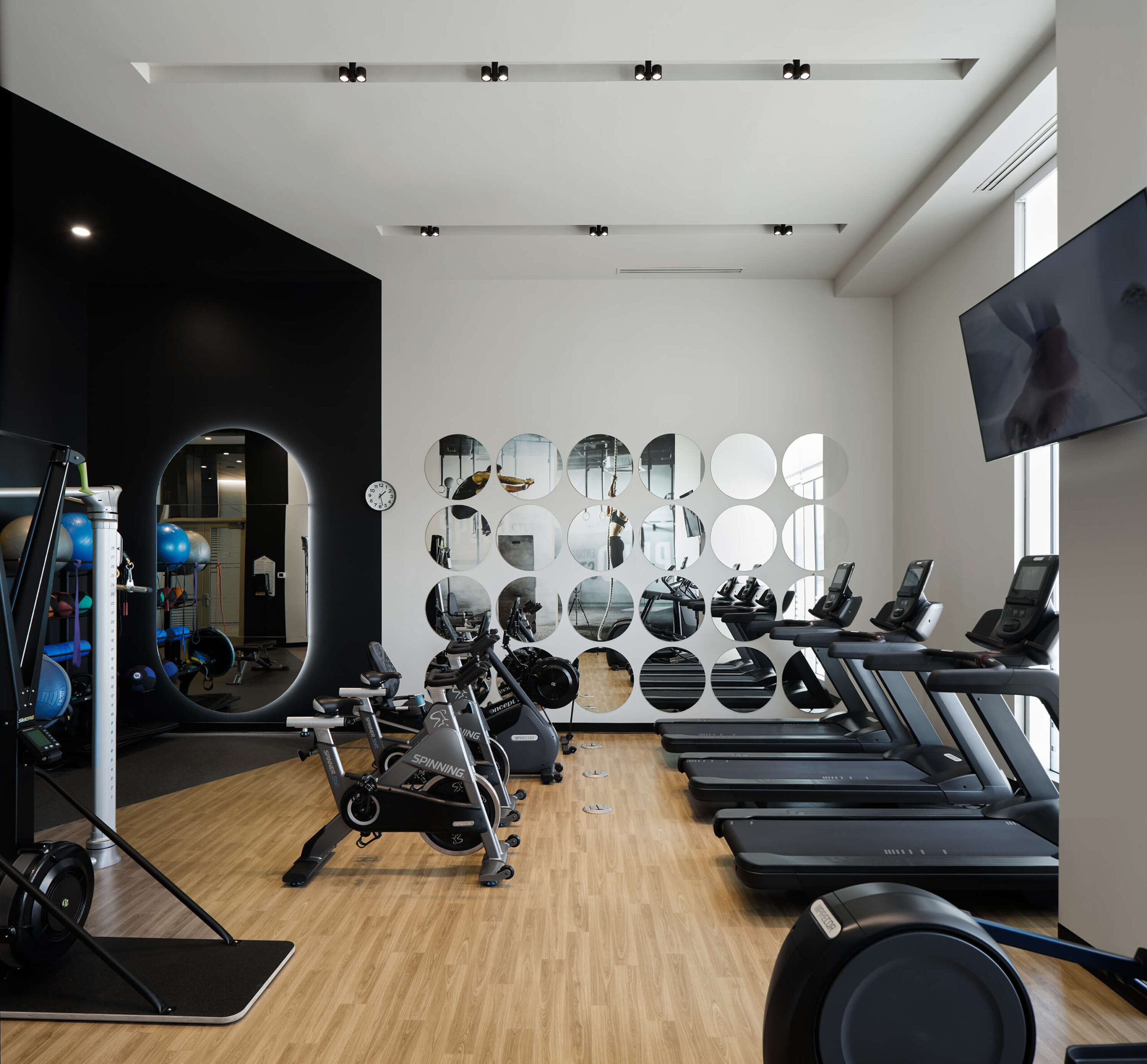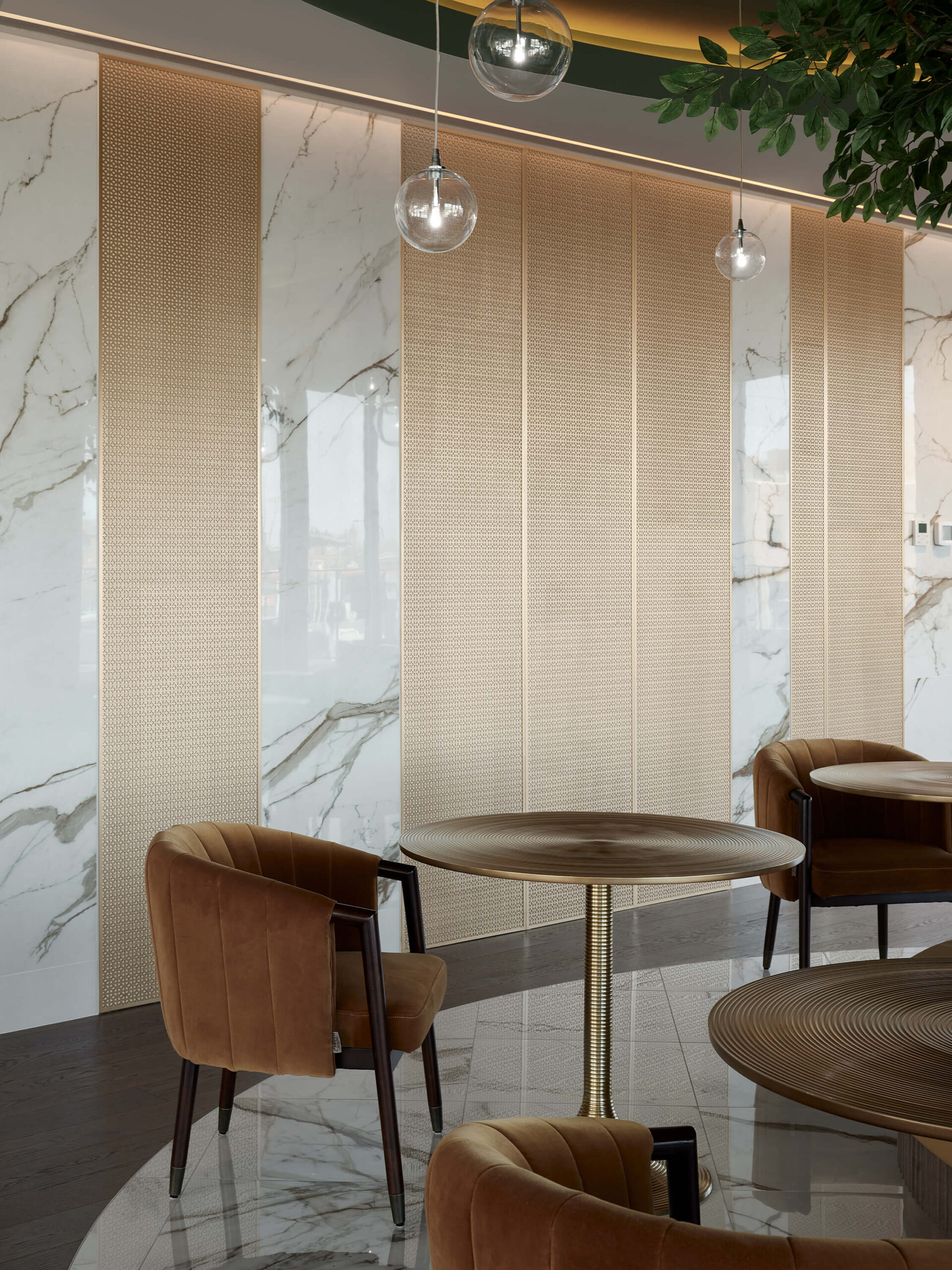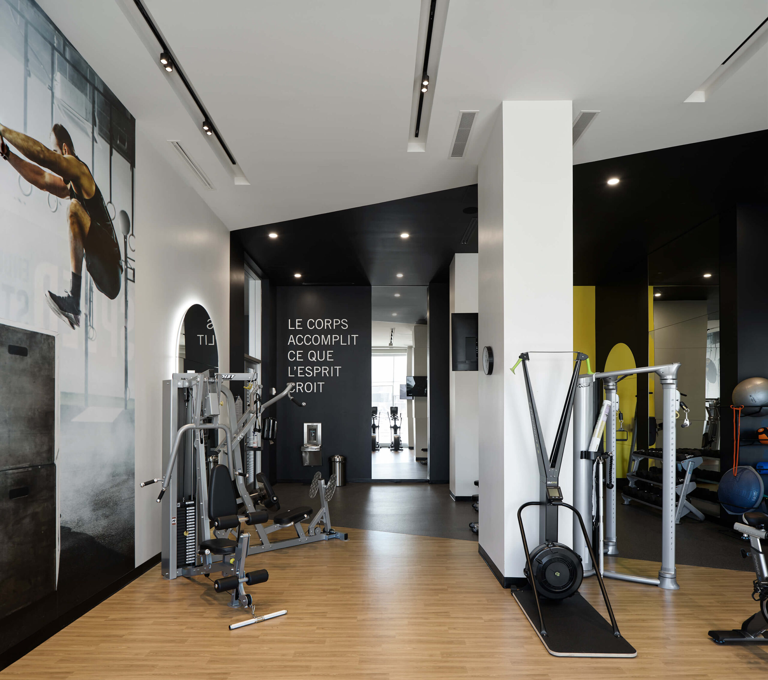The urban cottage located in the Belvedere Tower of the Voltige real estate project in Montréal, offers tenants a festive and inviting common space, where it is good to gather, share and have fun. It includes entertainment, relaxation, co-working spaces and an impressive common kitchen, all adjacent to a very large terrace and a pool. The urban cottage occupies a central place in the lives of the tenants, which is why we paid particular attention to the layout, finish selections and custom furniture design. For this urban cottage, neutral tones are supported by current accent colours such as pink and green, golden walls and a central tree defined by a circular ceiling drop that helps define the different spaces.
