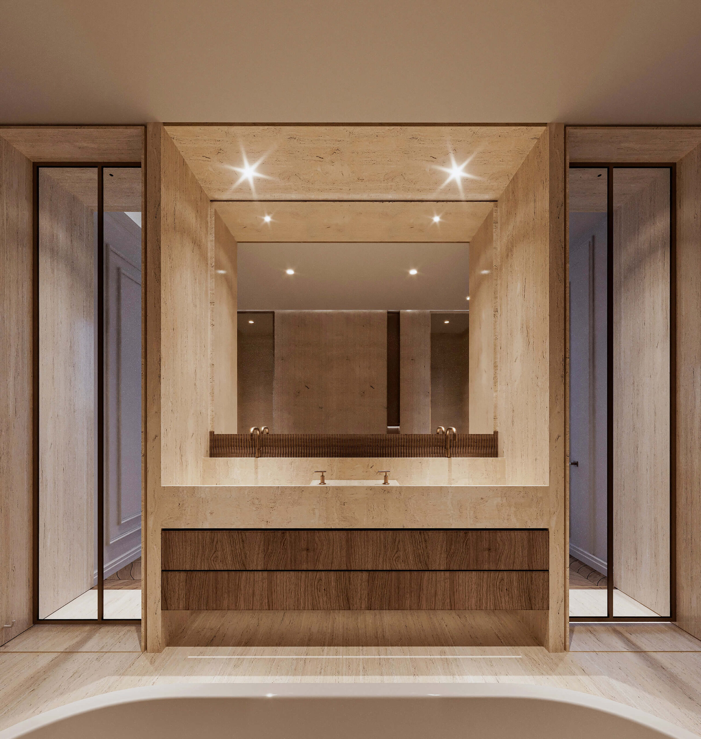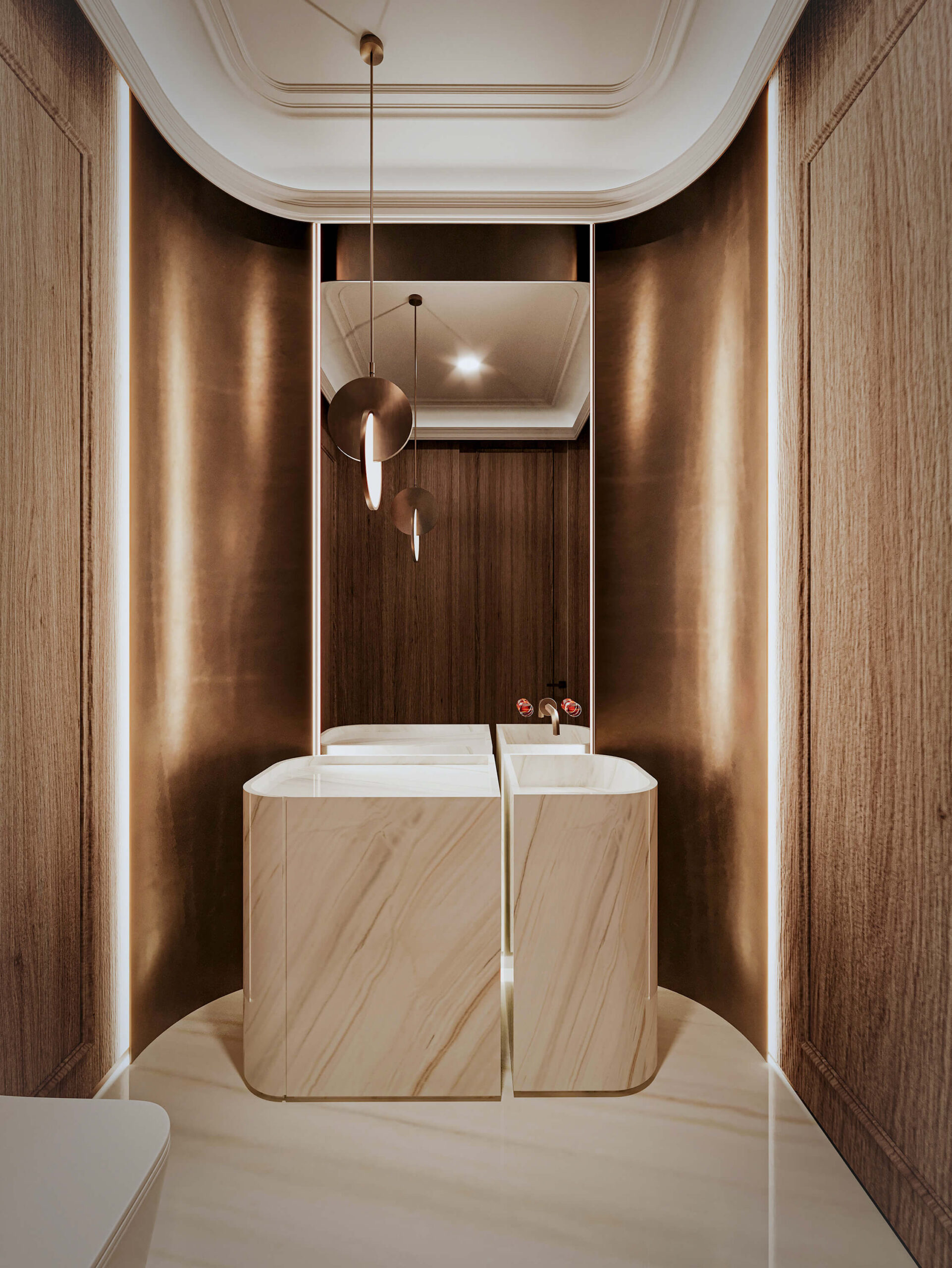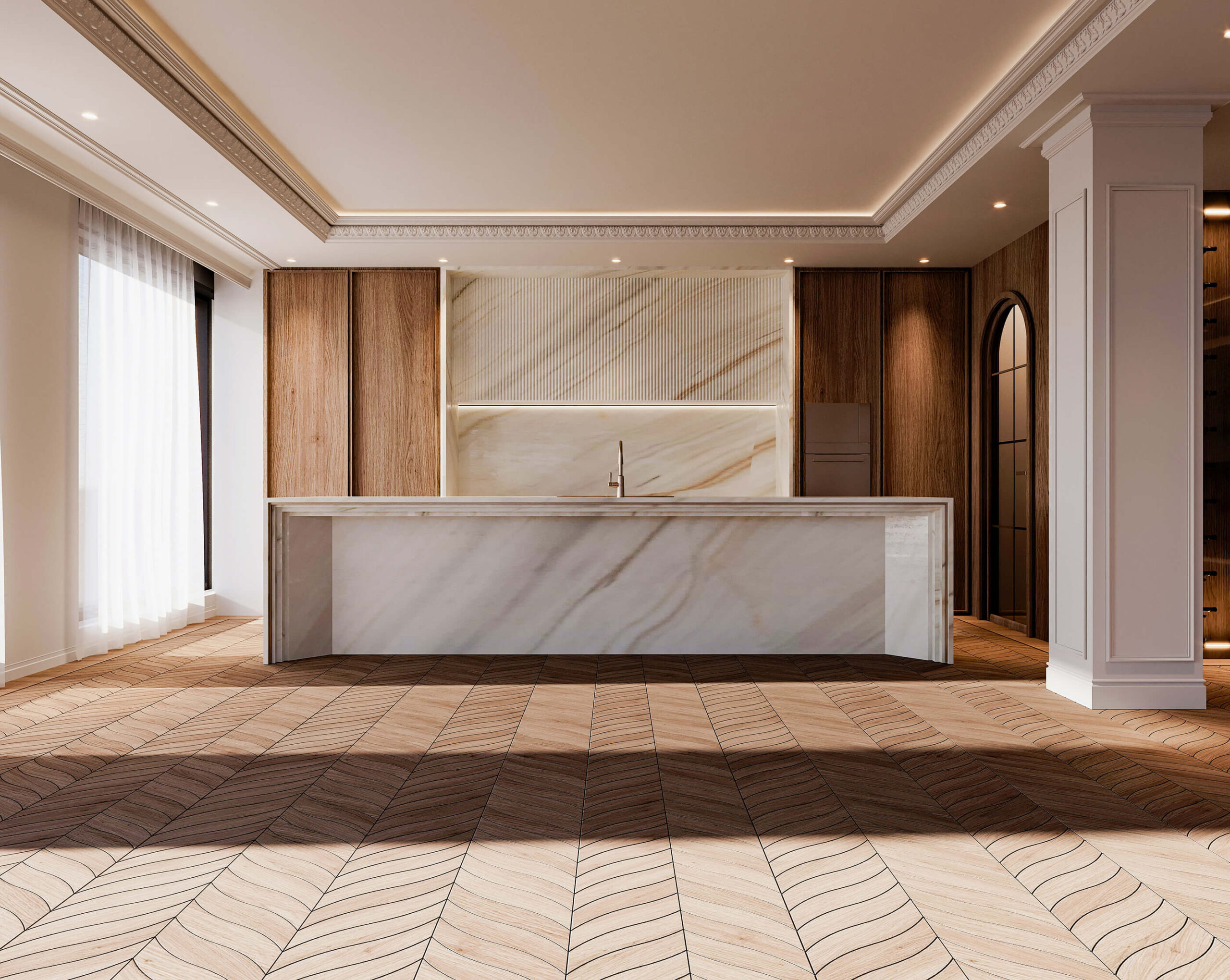Du marbre cannelé façonnant les cabinets, à l’éclairage architectural soigneusement orchestré, jusqu’au motif unique du plancher inspiré d’une feuille — chaque élément raconte une histoire de savoir-faire, de créativité et d’excellence.
